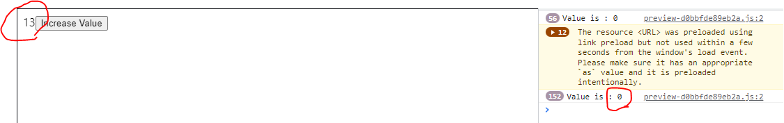 'Increase Value' 버튼을 누르면 위와 같이 value의 값은 업데이트 되지만, log되는 value는 아직 0이다. 이 경우 value를 useEffect의 deps array 안에 넣어주면 해결할 수 있다.